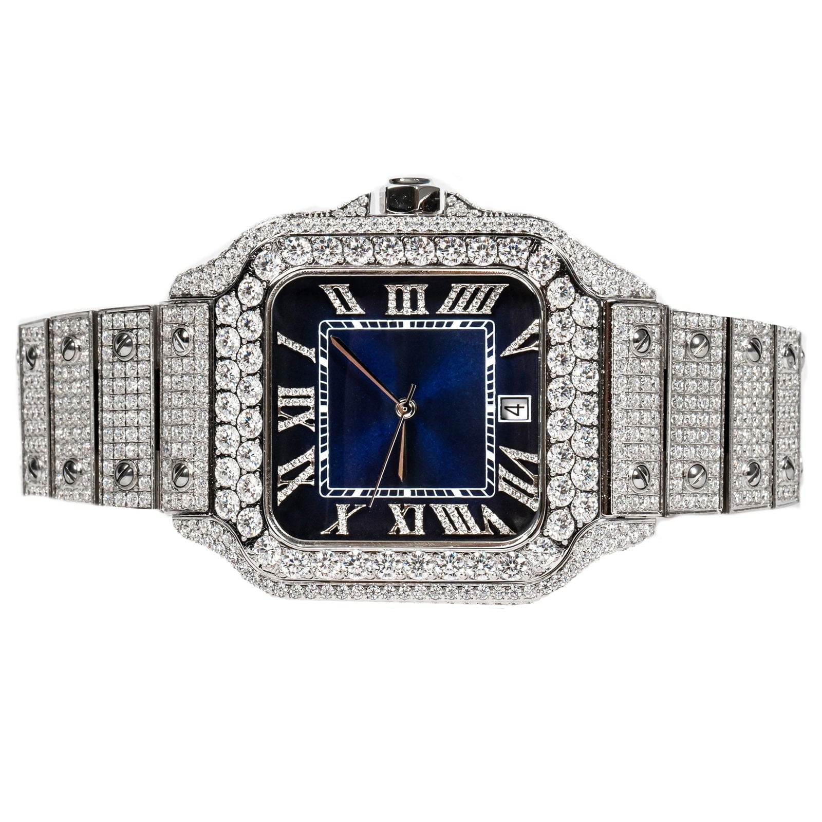 The navy blue dial adds a touch of depth and distinction, beautifully complementing the brilliance of the meticulously set VVS quality Moissanite, with a total carat weight of 20.20 carats. Each diamond is hand-selected to meet the highest standards of clarity and sparkle, creating a radiant display with every movement.